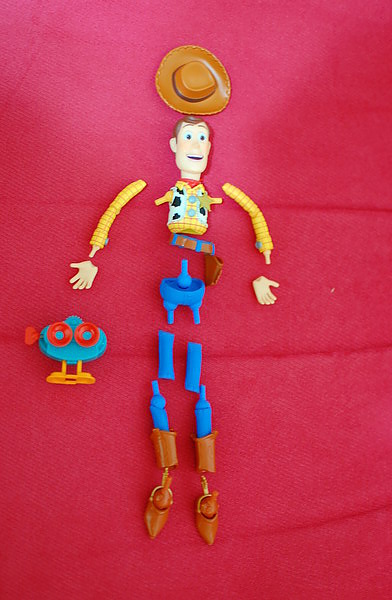 胡迪被綁住,而且日本人很細心,都還有用套子、塑膠袋來保護玩具不被鐵絲弄傷