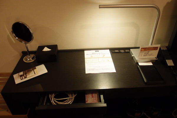 桌上有化妝鏡、小檯燈,抽屜裡有網路線…