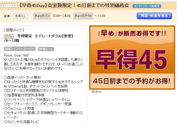 用早得45的PLAN訂了一晚¥11500,18平米的禁煙房,床寬140CM