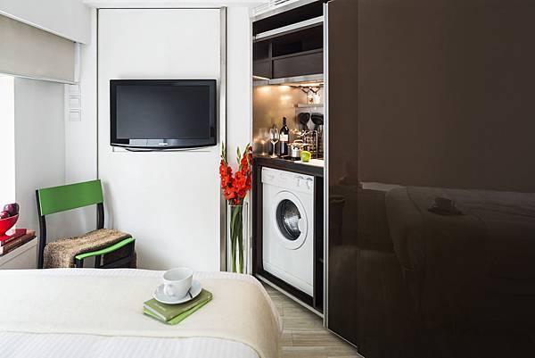 可以看到,這間房附有小型廚房和洗衣機 (有的房型只有小廚房沒有洗衣機)